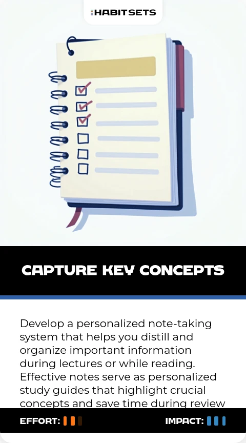Develop a personalized note-taking system that helps you distill and organize important information during lectures or while reading. Effective notes serve as personalized study guides that highlight crucial concepts and save time during review sessions.