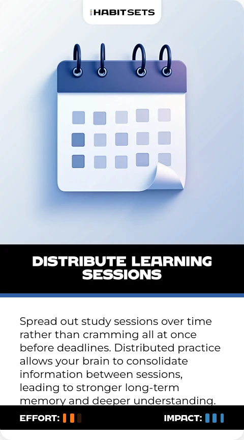Spread out study sessions over time rather than cramming all at once before deadlines. Distributed practice allows your brain to consolidate information between sessions, leading to stronger long-term memory and deeper understanding.