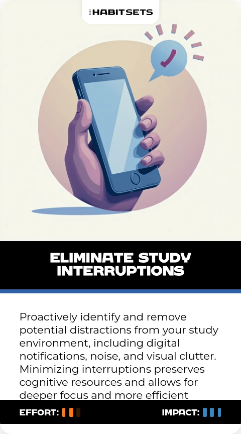 Proactively identify and remove potential distractions from your study environment, including digital notifications, noise, and visual clutter. Minimizing interruptions preserves cognitive resources and allows for deeper focus and more efficient learning.
