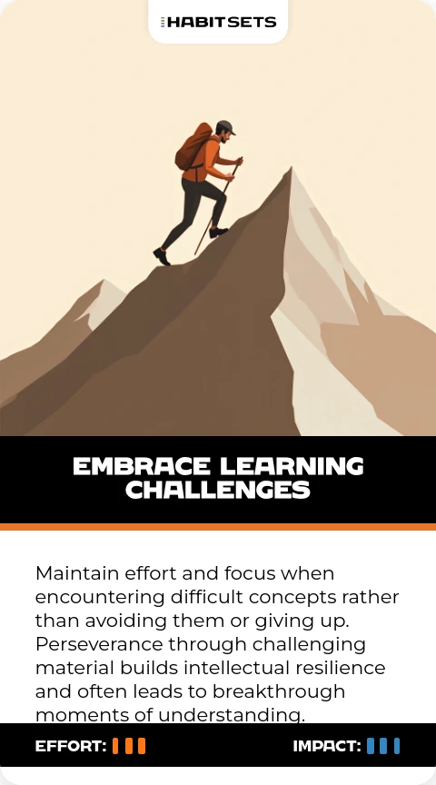 Maintain effort and focus when encountering difficult concepts rather than avoiding them or giving up. Perseverance through challenging material builds intellectual resilience and often leads to breakthrough moments of understanding.