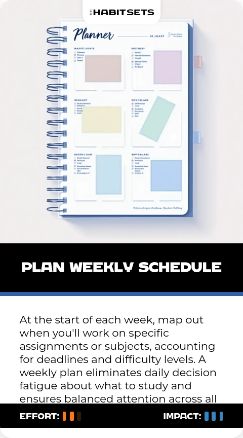 At the start of each week, map out when you'll work on specific assignments or subjects, accounting for deadlines and difficulty levels. A weekly plan eliminates daily decision fatigue about what to study and ensures balanced attention across all subjects.