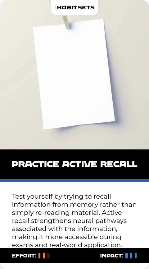 Test yourself by trying to recall information from memory rather than simply re-reading material. Active recall strengthens neural pathways associated with the information, making it more accessible during exams and real-world application.