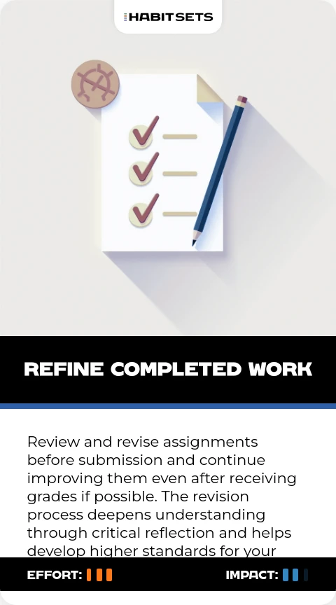 Review and revise assignments before submission and continue improving them even after receiving grades if possible. The revision process deepens understanding through critical reflection and helps develop higher standards for your work.