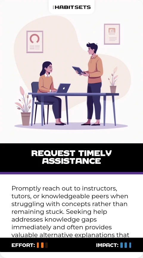 Promptly reach out to instructors, tutors, or knowledgeable peers when struggling with concepts rather than remaining stuck. Seeking help addresses knowledge gaps immediately and often provides valuable alternative explanations that make complex ideas click.