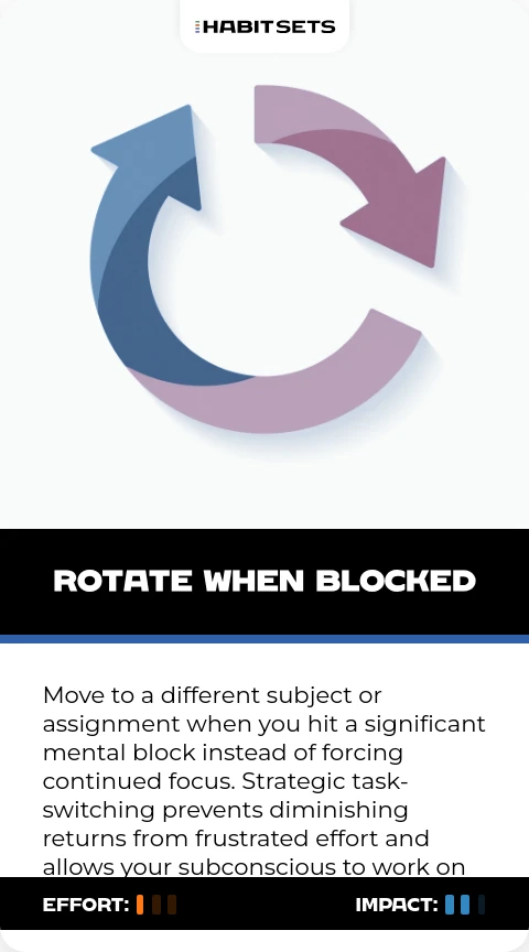 Move to a different subject or assignment when you hit a significant mental block instead of forcing continued focus. Strategic task-switching prevents diminishing returns from frustrated effort and allows your subconscious to work on problems in the background.
