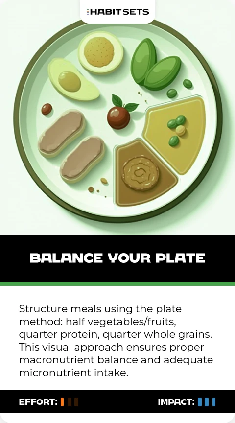 Fill half your plate with vegetables and fruits at each meal to ensure adequate nutrition and fiber intake. This simple visual approach helps maintain proper portions while maximizing nutrient density in your diet.