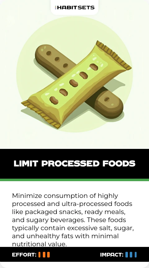 Reduce consumption of highly processed foods like packaged snacks, ready meals, and fast food. These items typically contain excessive sodium, sugar, unhealthy fats, and additives that can negatively impact health.