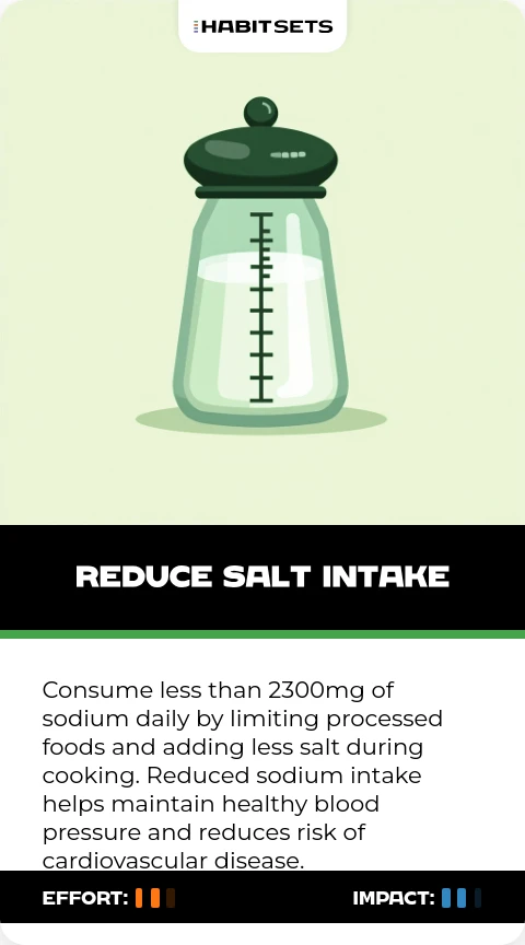 Limit daily sodium consumption to less than 5g (about one teaspoon) by using herbs and spices for flavor instead. Reducing salt helps prevent hypertension and lowers your risk of heart disease and stroke.