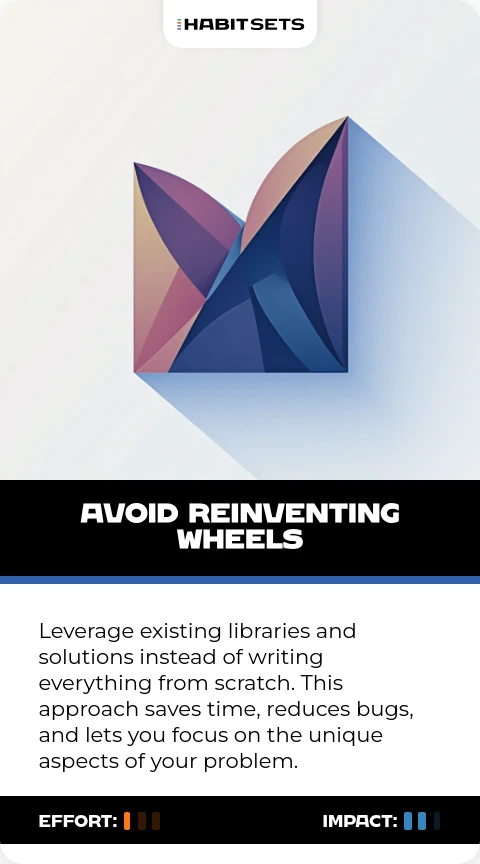 Leverage existing libraries and solutions instead of writing everything from scratch. This approach saves time, reduces bugs, and lets you focus on the unique aspects of your problem.