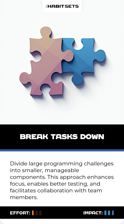 Divide large programming challenges into smaller, manageable components. This approach enhances focus, enables better testing, and facilitates collaboration with team members.