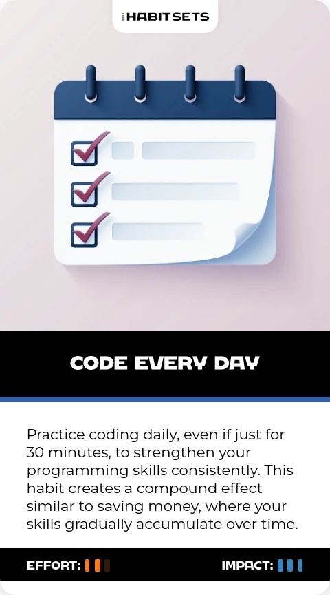 Practice coding daily, even if just for 30 minutes, to strengthen your programming skills consistently. This habit creates a compound effect similar to saving money, where your skills gradually accumulate over time.