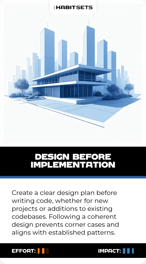 Create a clear design plan before writing code, whether for new projects or additions to existing codebases. Following a coherent design prevents corner cases and aligns with established patterns.