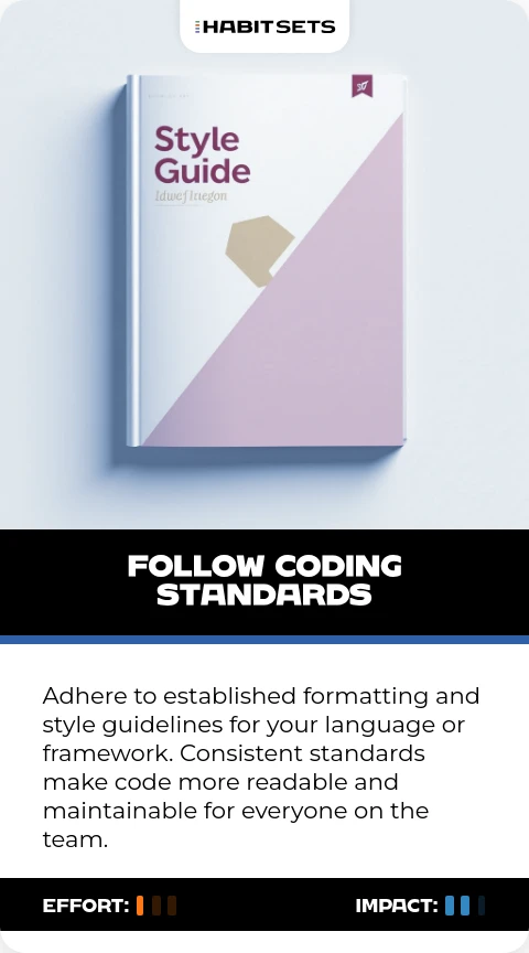 Adhere to established formatting and style guidelines for your language or framework. Consistent standards make code more readable and maintainable for everyone on the team.