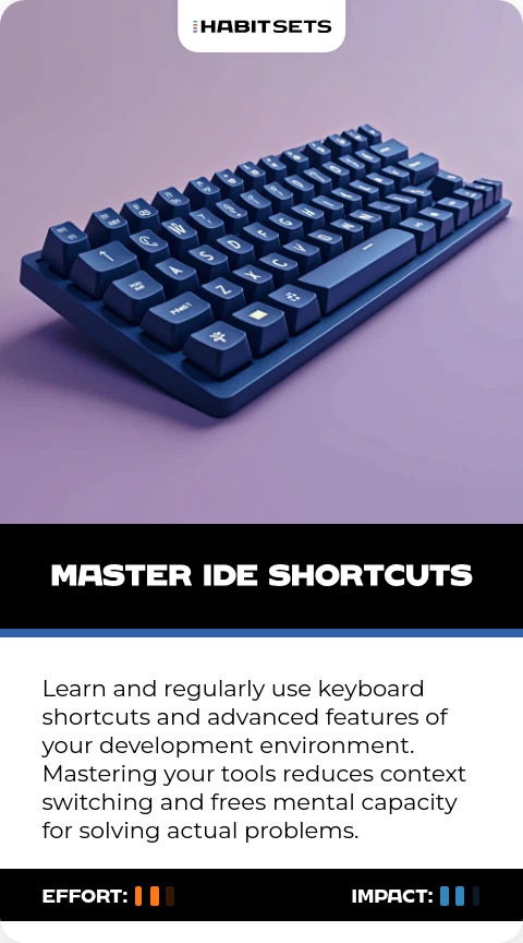 Learn and regularly use keyboard shortcuts and advanced features of your development environment. Mastering your tools reduces context switching and frees mental capacity for solving actual problems.