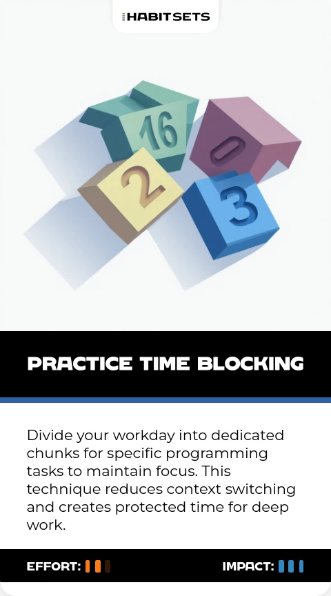 Divide your workday into dedicated chunks for specific programming tasks to maintain focus. This technique reduces context switching and creates protected time for deep work.