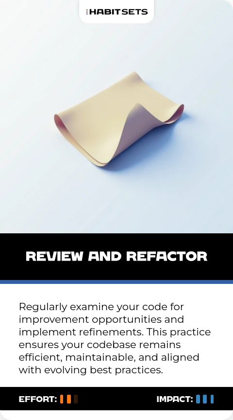 Regularly examine your code for improvement opportunities and implement refinements. This practice ensures your codebase remains efficient, maintainable, and aligned with evolving best practices.