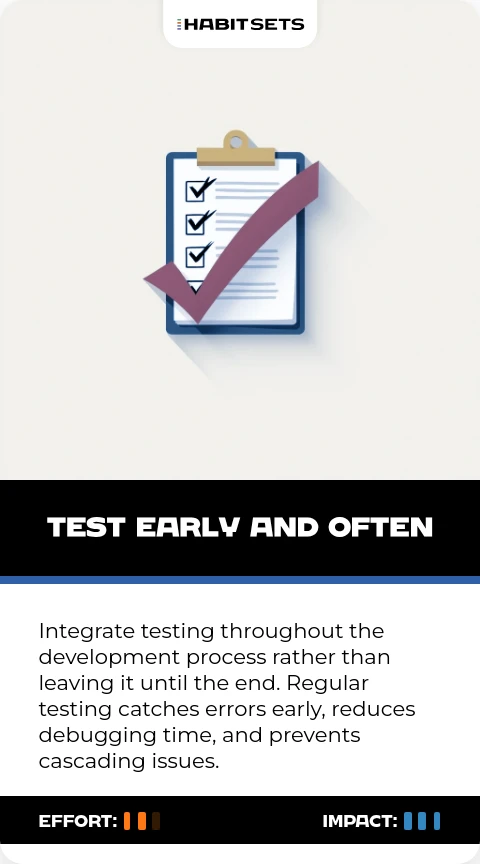 Integrate testing throughout the development process rather than leaving it until the end. Regular testing catches errors early, reduces debugging time, and prevents cascading issues.
