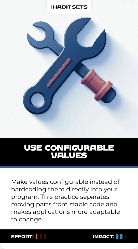 Make values configurable instead of hardcoding them directly into your program. This practice separates moving parts from stable code and makes applications more adaptable to change.