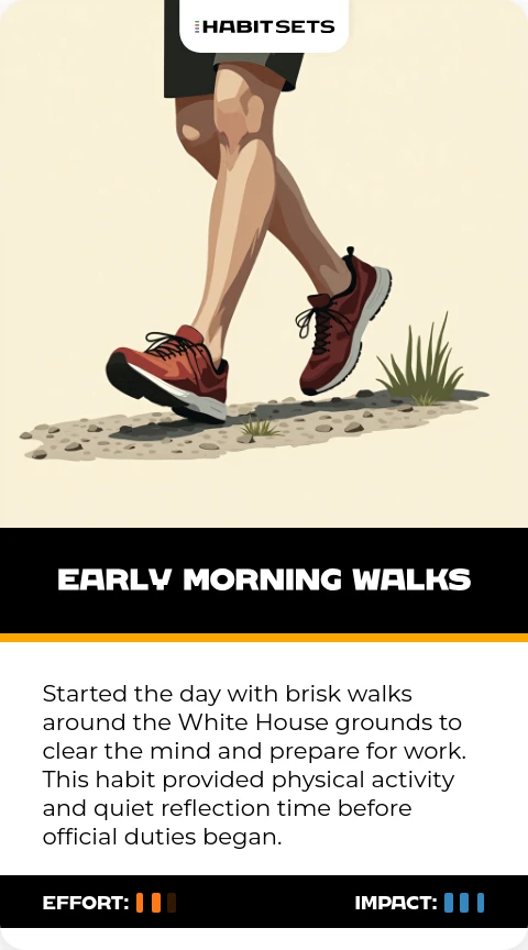 Started the day with brisk walks around the White House grounds to clear the mind and prepare for work. This habit provided physical activity and quiet reflection time before official duties began.