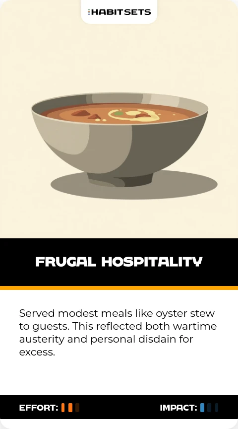 Served modest meals like oyster stew to guests. This reflected both wartime austerity and personal disdain for excess.