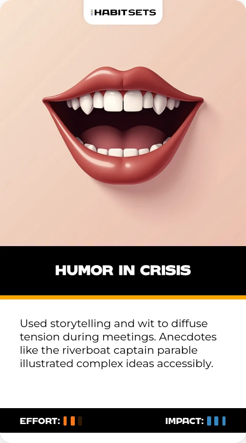 Used storytelling and wit to diffuse tension during meetings. Anecdotes like the riverboat captain parable illustrated complex ideas accessibly.