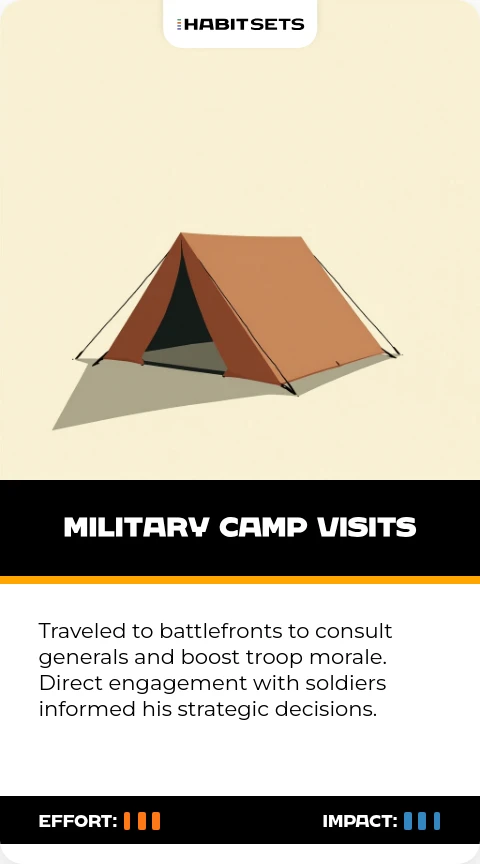 Traveled to battlefronts to consult generals and boost troop morale. Direct engagement with soldiers informed his strategic decisions.