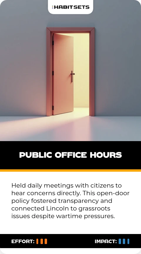 Held daily meetings with citizens to hear concerns directly. This open-door policy fostered transparency and connected Lincoln to grassroots issues despite wartime pressures.