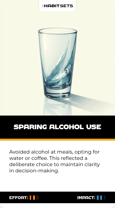Avoided alcohol at meals, opting for water or coffee. This reflected a deliberate choice to maintain clarity in decision-making.