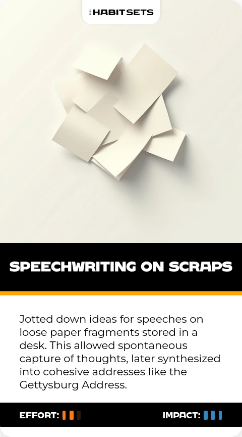 Jotted down ideas for speeches on loose paper fragments stored in a desk. This allowed spontaneous capture of thoughts, later synthesized into cohesive addresses like the Gettysburg Address.