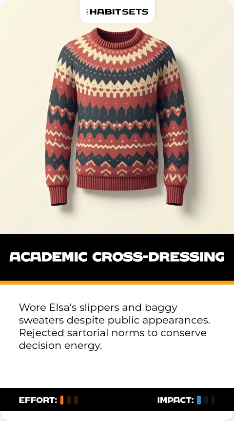 Wore Elsa's slippers and baggy sweaters despite public appearances. Rejected sartorial norms to conserve decision energy.