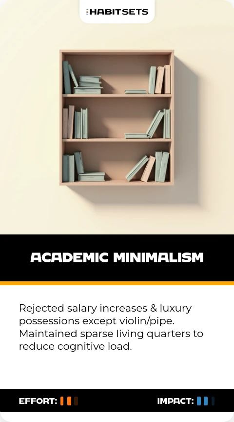 Rejected salary increases & luxury possessions except violin/pipe. Maintained sparse living quarters to reduce cognitive load.