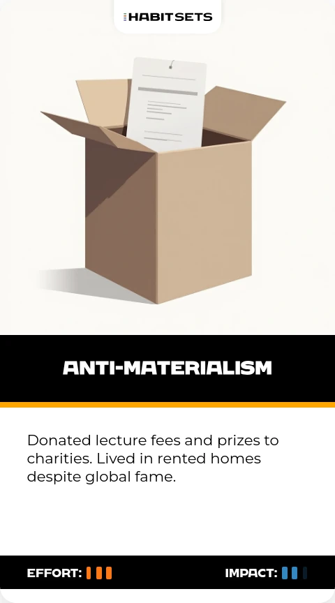 Donated lecture fees and prizes to charities. Lived in rented homes despite global fame.