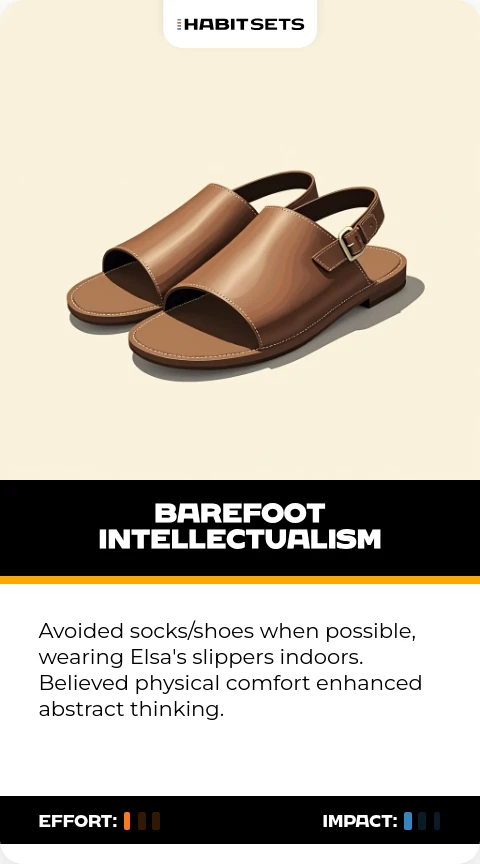 Avoided socks/shoes when possible, wearing Elsa's slippers indoors. Believed physical comfort enhanced abstract thinking.