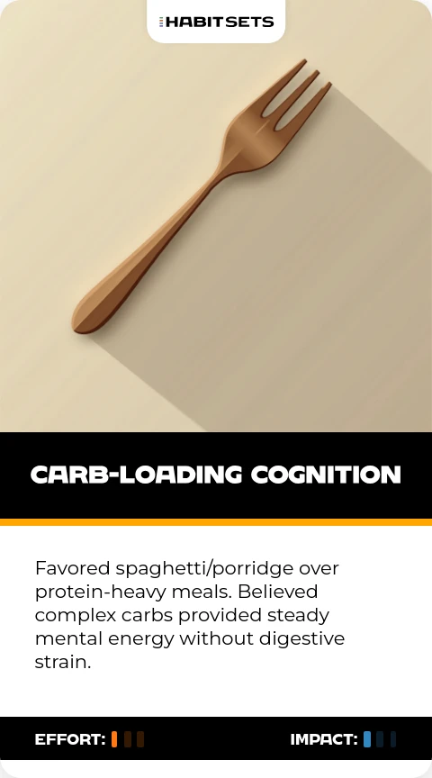 Favored spaghetti/porridge over protein-heavy meals. Believed complex carbs provided steady mental energy without digestive strain.