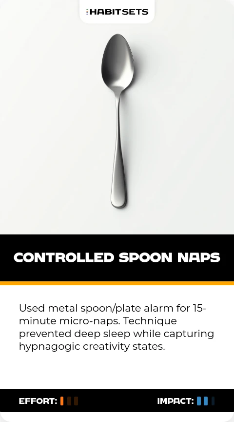 Used metal spoon/plate alarm for 15-minute micro-naps. Technique prevented deep sleep while capturing hypnagogic creativity states.