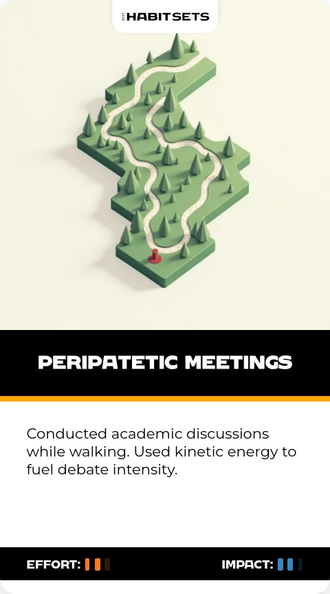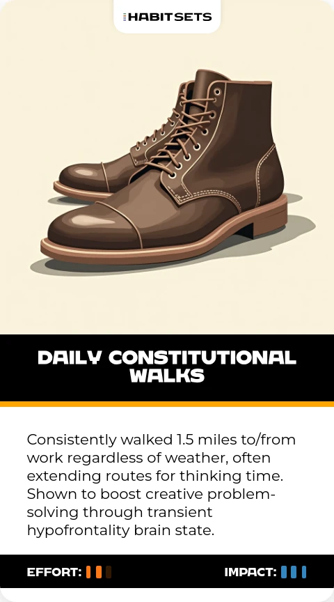 Consistently walked 1.5 miles to/from work regardless of weather, often extending routes for thinking time. Shown to boost creative problem-solving through transient hypofrontality brain state.
