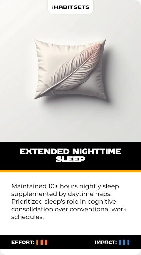 Maintained 10+ hours nightly sleep supplemented by daytime naps. Prioritized sleep's role in cognitive consolidation over conventional work schedules.