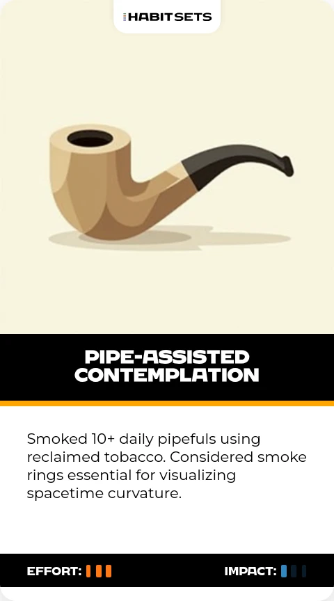 Smoked 10+ daily pipefuls using reclaimed tobacco. Considered smoke rings essential for visualizing spacetime curvature.