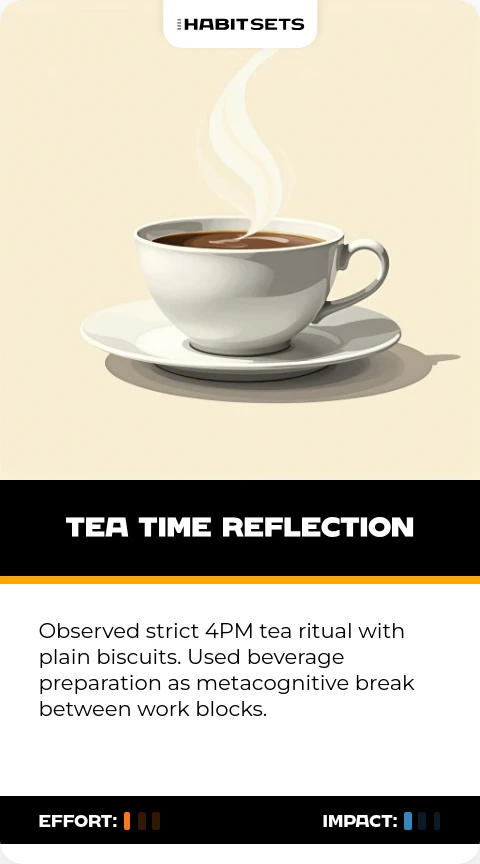 Observed strict 4PM tea ritual with plain biscuits. Used beverage preparation as metacognitive break between work blocks.