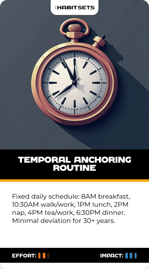Fixed daily schedule: 8AM breakfast, 10:30AM walk/work, 1PM lunch, 2PM nap, 4PM tea/work, 6:30PM dinner. Minimal deviation for 30+ years.