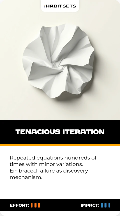 Repeated equations hundreds of times with minor variations. Embraced failure as discovery mechanism.