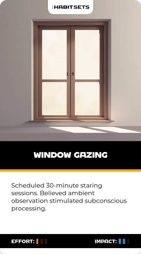Scheduled 30-minute staring sessions. Believed ambient observation stimulated subconscious processing.