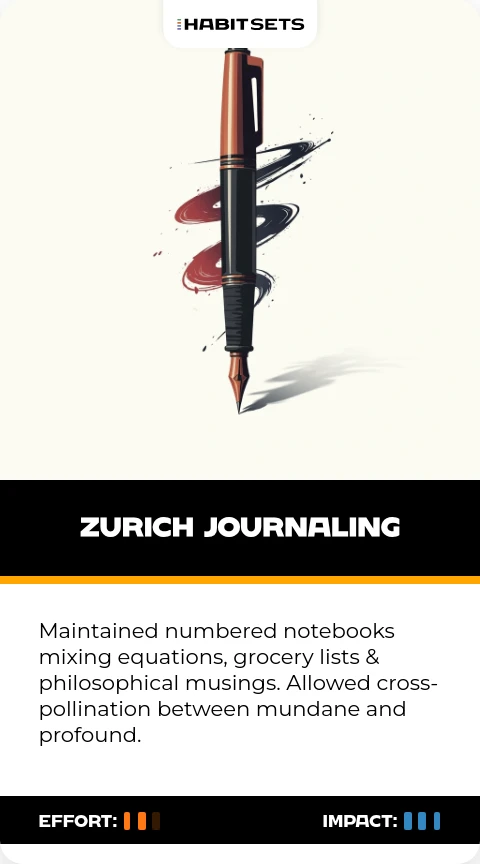 Maintained numbered notebooks mixing equations, grocery lists & philosophical musings. Allowed cross-pollination between mundane and profound.