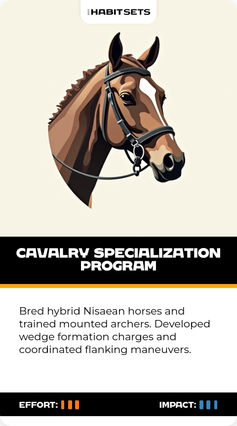 Bred hybrid Nisaean horses and trained mounted archers. Developed wedge formation charges and coordinated flanking maneuvers.