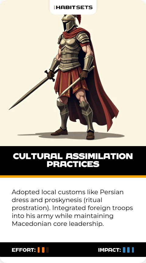 Adopted local customs like Persian dress and proskynesis (ritual prostration). Integrated foreign troops into his army while maintaining Macedonian core leadership.