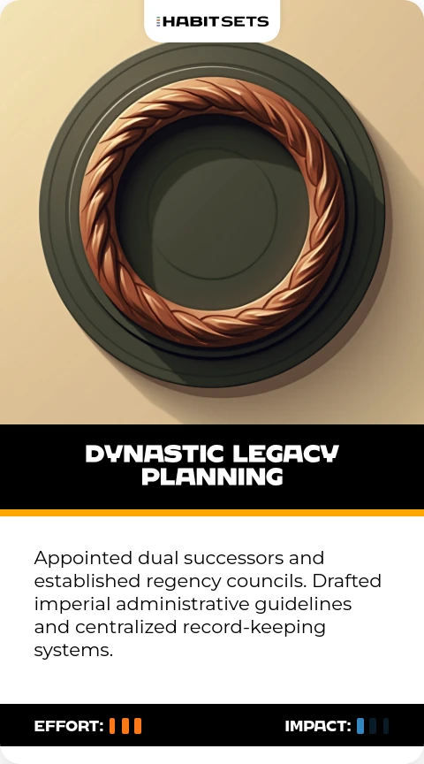 Appointed dual successors and established regency councils. Drafted imperial administrative guidelines and centralized record-keeping systems.