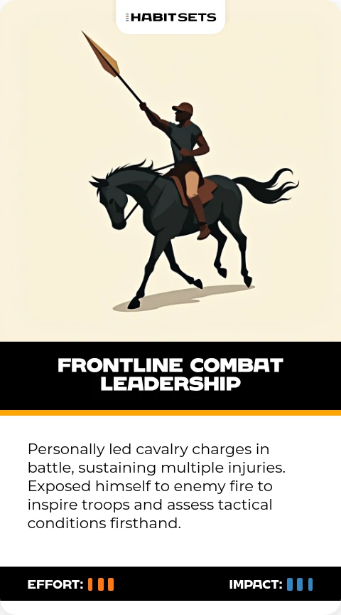 Personally led cavalry charges in battle, sustaining multiple injuries. Exposed himself to enemy fire to inspire troops and assess tactical conditions firsthand.