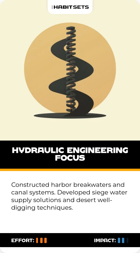 Constructed harbor breakwaters and canal systems. Developed siege water supply solutions and desert well-digging techniques.