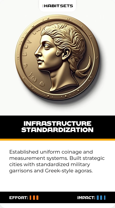 Established uniform coinage and measurement systems. Built strategic cities with standardized military garrisons and Greek-style agoras.