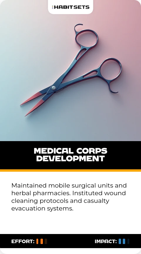 Maintained mobile surgical units and herbal pharmacies. Instituted wound cleaning protocols and casualty evacuation systems.